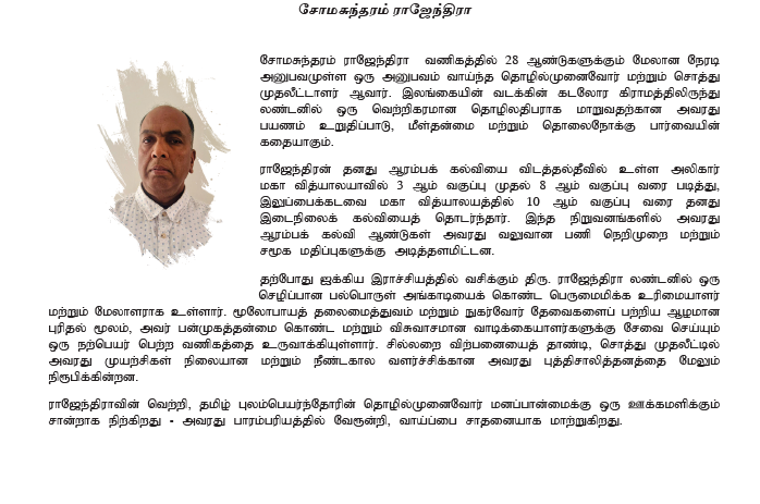 சோமசுந்தரம் ராஜேந்திரா வணிகத்தில் 28 ஆண்டுகளுக்கும் மேலான நேரடி அனுபவமுள்ள ஒரு அனுபவம் வாய்ந்த தொழில்முனைவோர் மற்றும் சொத்து முதலீட்டாளர் ஆவார். இலங்கையின் வடக்கின் கடலோர கிராமத்திலிருந்து லண்டனில் ஒரு வெற்றிகரமான தொழிலதிபராக மாறுவதற்கான அவரது பயணம் உறுதிப்பாடு, மீள்தன்மை மற்றும் தொலைநோக்கு பார்வையின் கதையாகும்.